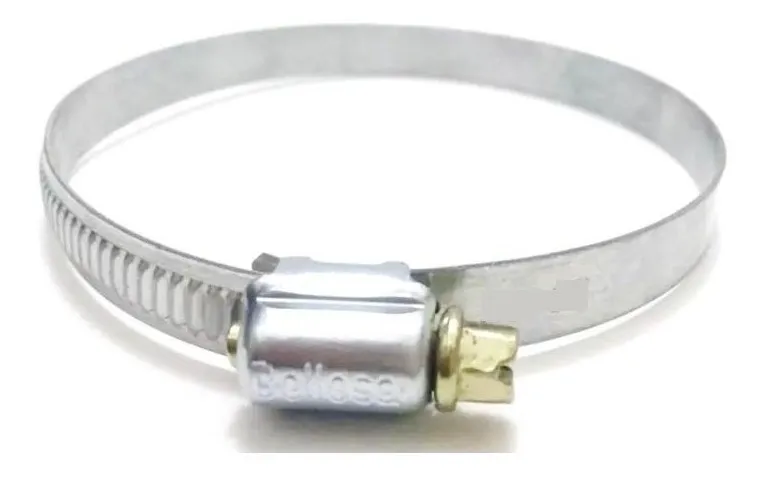 Abraçadeira do tipo rosca sem fim fabricada em aço carbono com acabamento superficial zincada, e parafuso bicromatizado.